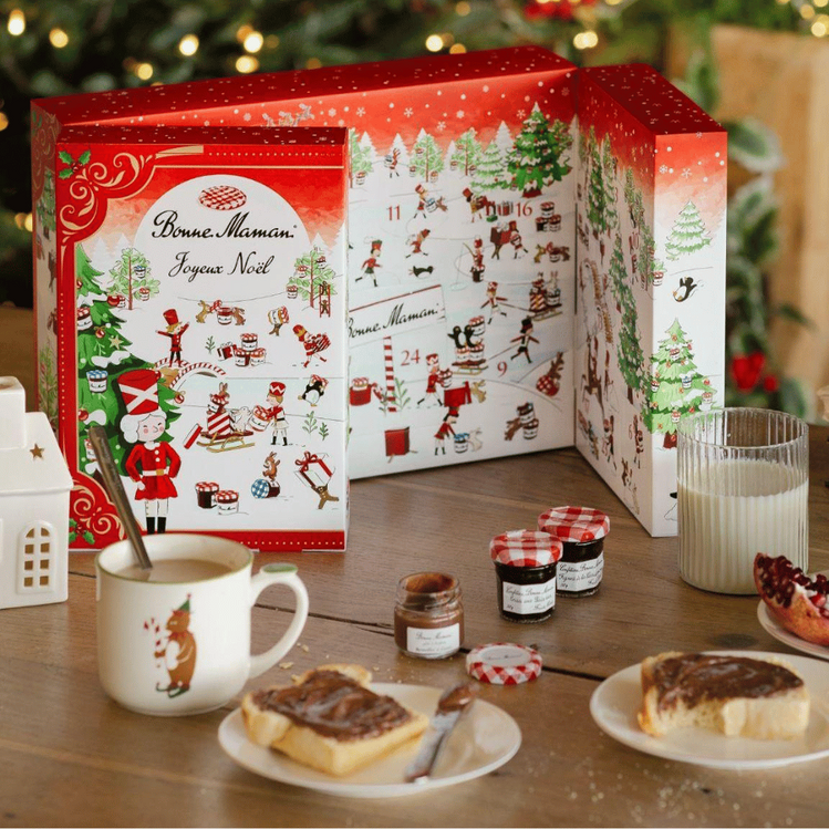 Kalendarz adwentowy wypełniony mini dżemikami i kremami marki Bonne Maman + prezent niespodzinka! Wspaniały pomysł na uroczy prezent! Duży kalendarz w kształcie pięknej rozkładanej makiety w śnieżnej świątecznej scenerii. Zestaw składa się z 23 małych słoiczków z różnymi smakami dżemików, konfitur i kremów. W ostatnim okienku czeka na Was prezent - piękny świąteczny akcent na wyjątkowy wigilijny dzień!Kalendarz jest makietą, po rozłożeniu której ukazują się 24 okienka, które wypełnione są pysznymi francuskimi konfiturami. Każdy smak jest niepowtarzalny i niedostępny w stałej ofercie. Bonne Maman postanowiło przygotować naprawdę wyjątkowe połączenia smakowe. Czekają na Was następujące smaki:
